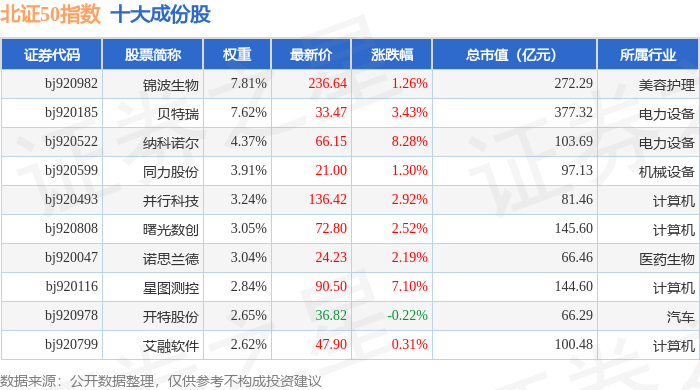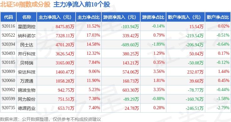 资金流向方面,北证50(899050)指数成份股当日主力资金净流入合计2.26亿元,游资资金净流出合计5272.86万元,散户资金净流入合计427.89万元。成份股资金流向详情见下表: