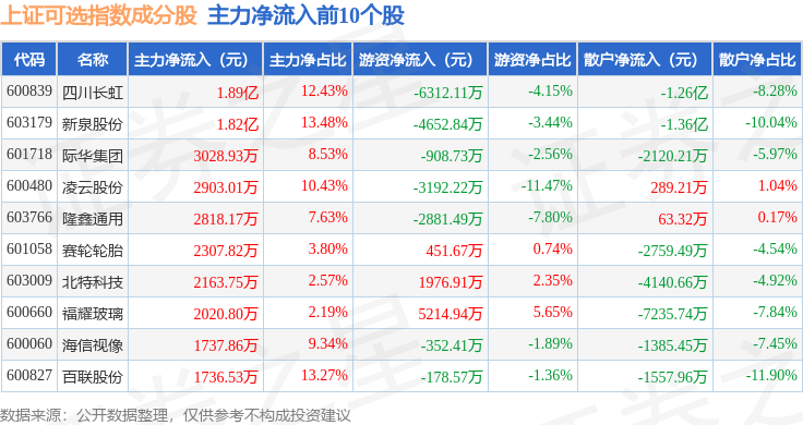 资金流向方面,上证可选(000035)指数成份股当日主力资金净流出合计8.18亿元,游资资金净流入合计5.86亿元,散户资金净流入合计2.32亿元。成份股资金流向详情见下表: