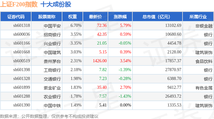 上证F200(000098)指数十大成份股详情如下: