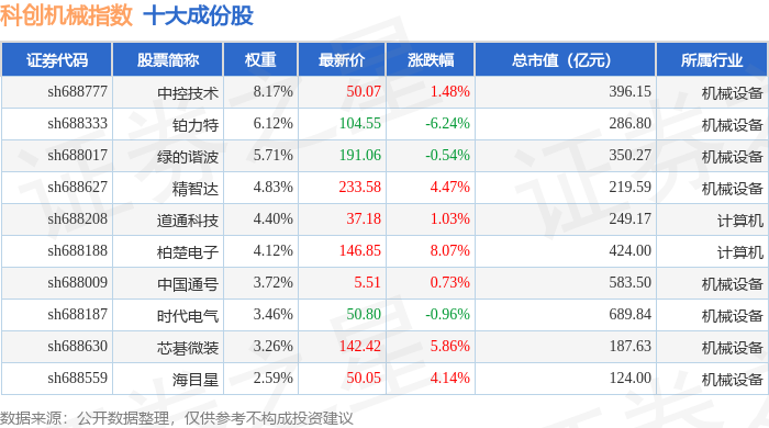 证券之星消息,1月5日,科创机械(000693)指数报收于1457.41点,涨2.12%,成交218.3亿元,换手率1.54%。当日该指数成份股中,上涨的有38家,华曙高科以19.99%的涨幅领涨,下跌的有12家,铂力特以6.24%的跌幅领跌。