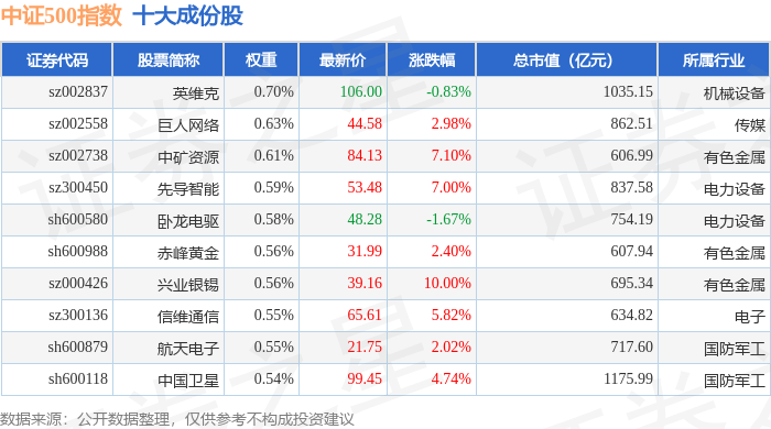 中证500(000905)指数十大成份股详情如下:
