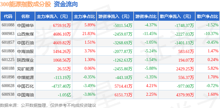 资金流向方面,300能源(000908)指数成份股当日主力资金净流入合计3322.88万元,游资资金净流出合计5112.63万元,散户资金净流入合计1789.75万元。成份股资金流向详情见下表: