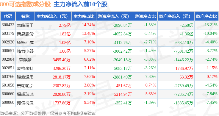 资金流向方面,800可选(000931)指数成份股当日主力资金净流出合计18.72亿元,游资资金净流入合计5.15亿元,散户资金净流入合计13.56亿元。成份股资金流向详情见下表: