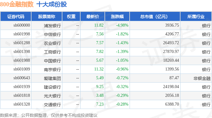 证券之星消息,1月5日,800金融(000974)指数报收于7143.25点,涨1.46%,成交924.22亿元,换手率0.57%。当日该指数成份股中,上涨的有32家,新华保险以8.87%的涨幅领涨,下跌的有12家,浦发银行以4.98%的跌幅领跌。