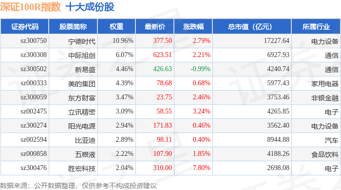 深证100R(399004)指数十大成份股详情如下: