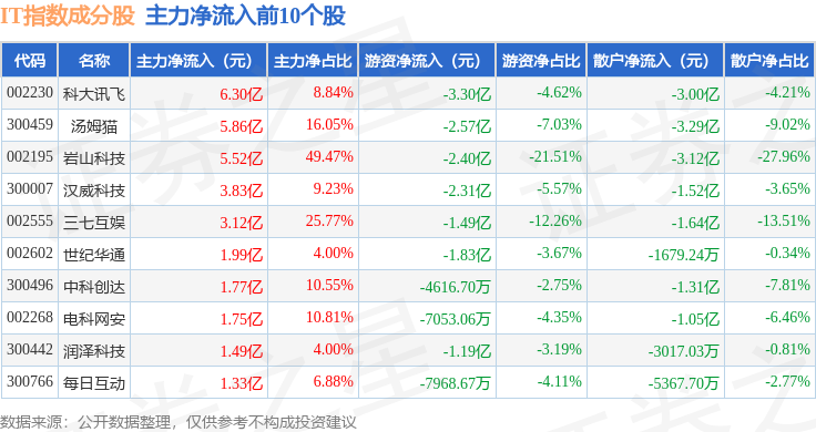 资金流向方面,IT指数(399239)成份股当日主力资金净流入合计20.35亿元,游资资金净流出合计26.43亿元,散户资金净流入合计6.08亿元。成份股资金流向详情见下表: