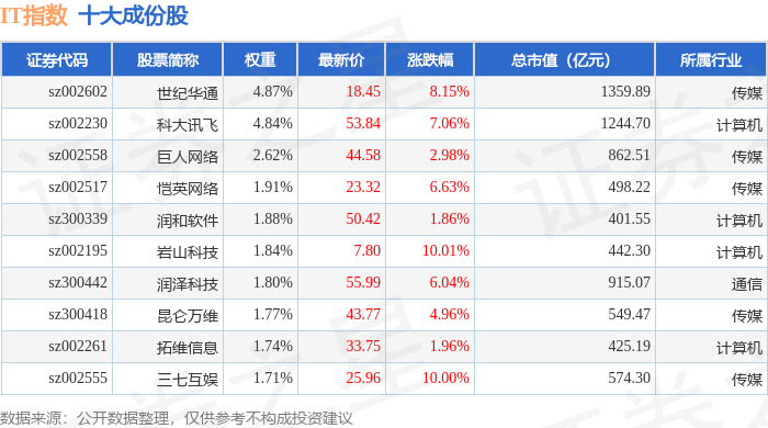 IT指数(399239)十大成份股详情如下: