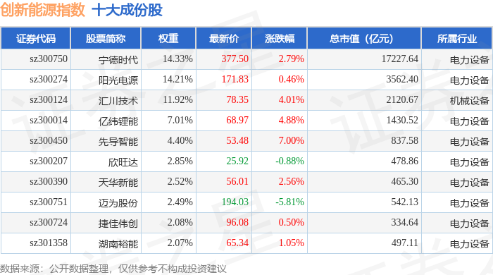 创新能源(399266)指数十大成份股详情如下: