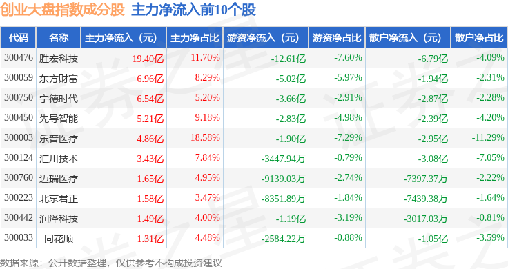 资金流向方面,创业大盘(399293)指数成份股当日主力资金净流入合计16.06亿元,游资资金净流出合计11.17亿元,散户资金净流出合计4.89亿元。成份股资金流向详情见下表: