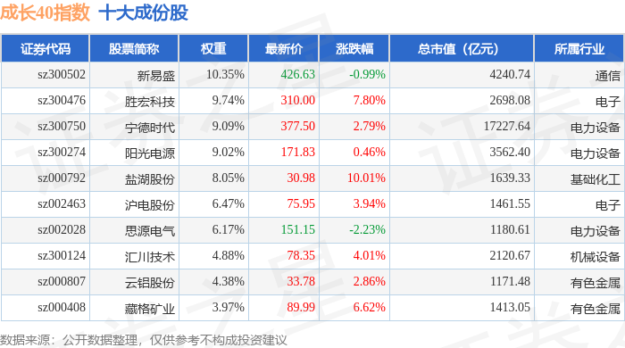 成长40(399326)指数十大成份股详情如下: