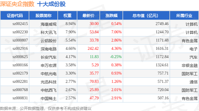 深证央企(399335)指数十大成份股详情如下: