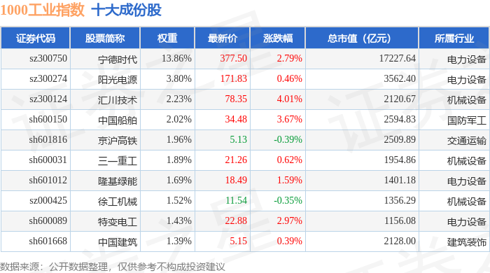1000工业(399383)指数十大成份股详情如下: