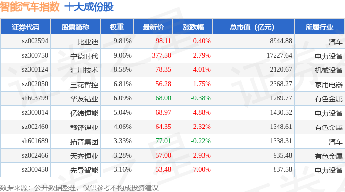 智能汽车(399432)指数十大成份股详情如下: