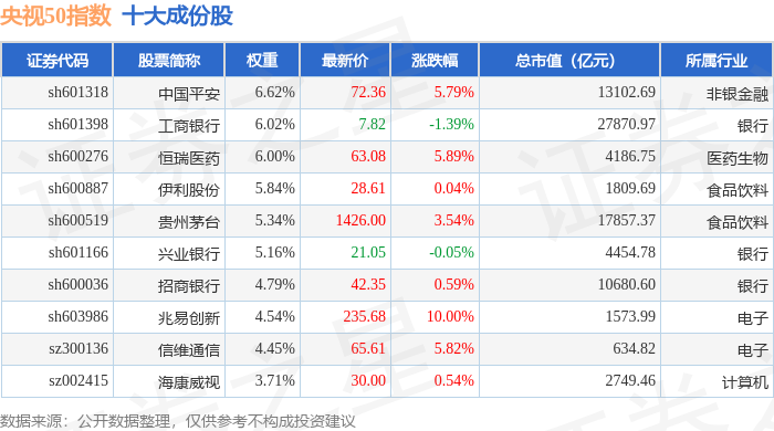 证券之星消息,1月5日,央视50(399550)指数报收于8306.78点,涨2.66%,成交1037.75亿元,换手率0.45%。当日该指数成份股中,上涨的有43家,乐普医疗以19.99%的涨幅领涨,下跌的有7家,工商银行以1.39%的跌幅领跌。