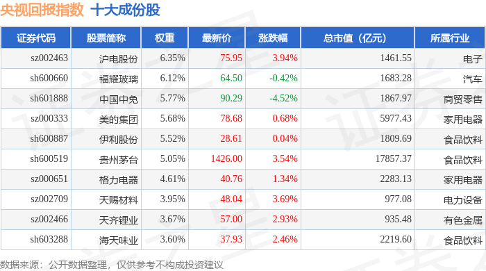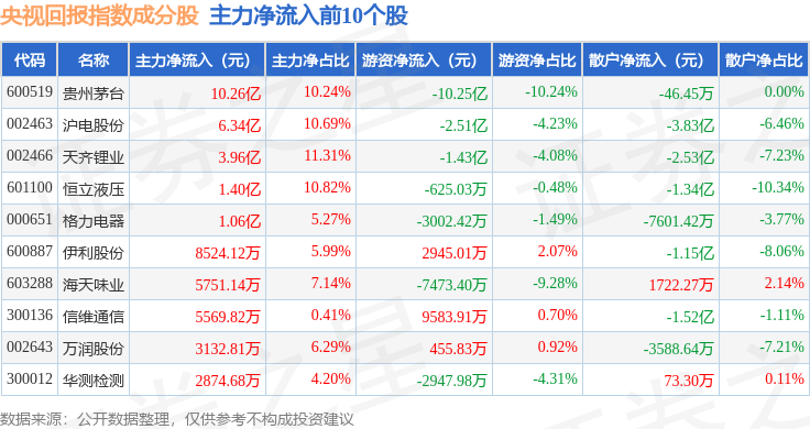 资金流向方面,央视回报(399553)指数成份股当日主力资金净流入合计16.23亿元,游资资金净流出合计8.8亿元,散户资金净流出合计7.43亿元。成份股资金流向详情见下表:
