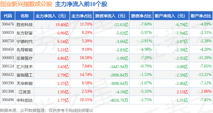 资金流向方面,创业新兴(399643)指数成份股当日主力资金净流入合计22.93亿元,游资资金净流出合计18.74亿元,散户资金净流出合计4.19亿元。成份股资金流向详情见下表: