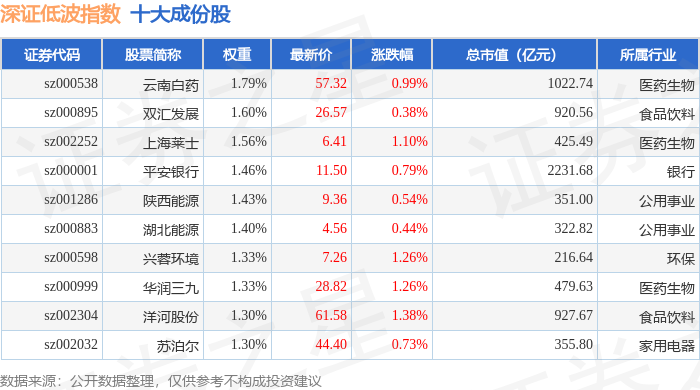 深证低波(399661)指数十大成份股详情如下: