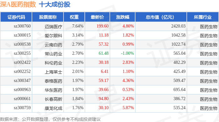 深A医药(399674)指数十大成份股详情如下: