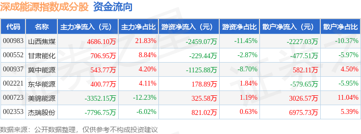 资金流向方面,深成能源(399680)指数成份股当日主力资金净流出合计4811.31万元,游资资金净流出合计2488.9万元,散户资金净流入合计7300.22万元。成份股资金流向详情见下表: