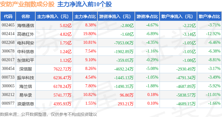 资金流向方面,安防产业(399693)指数成份股当日主力资金净流出合计5.75亿元,游资资金净流出合计4.35亿元,散户资金净流入合计10.1亿元。成份股资金流向详情见下表: