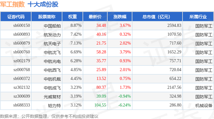 军工指数(399959)十大成份股详情如下: