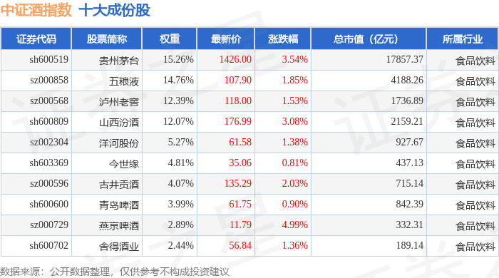 证券之星消息,1月5日,中证酒(399987)指数报收于5096.12点,涨1.97%,成交191.53亿元,换手率0.93%。当日该指数成份股中,上涨的有27家,燕京啤酒以4.99%的涨幅领涨。