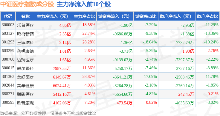资金流向方面,中证医疗(399989)指数成份股当日主力资金净流入合计15.34亿元,游资资金净流出合计13.94亿元,散户资金净流出合计1.25亿元。成份股资金流向详情见下表: