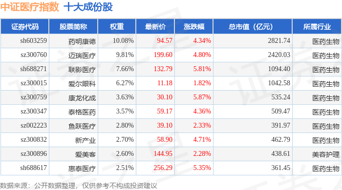 中证医疗(399989)指数十大成份股详情如下: