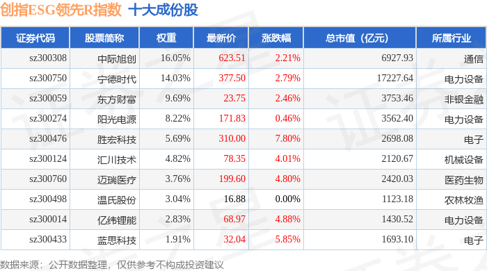 创指ESG领先R(470031)指数十大成份股详情如下: