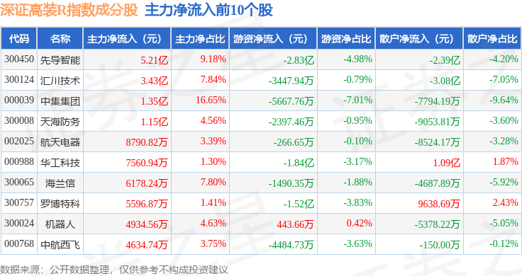 资金流向方面,深证高装R(470037)指数成份股当日主力资金净流出合计6.08亿元,游资资金净流出合计8.97亿元,散户资金净流入合计15.05亿元。成份股资金流向详情见下表: