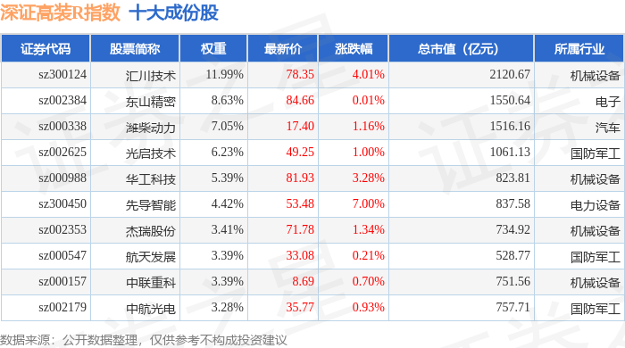 深证高装R(470037)指数十大成份股详情如下: