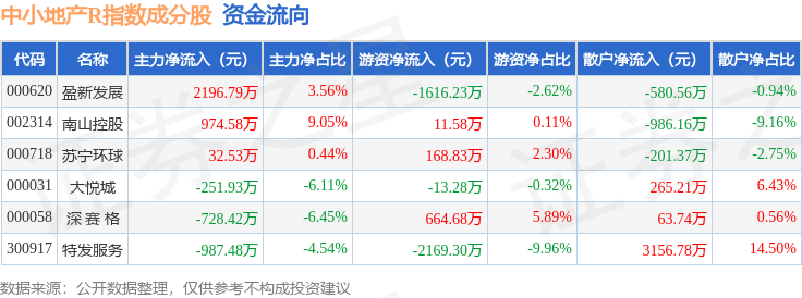 资金流向方面,中小地产R(471002)指数成份股当日主力资金净流入合计1236.07万元,游资资金净流出合计2953.71万元,散户资金净流入合计1717.64万元。成份股资金流向详情见下表: