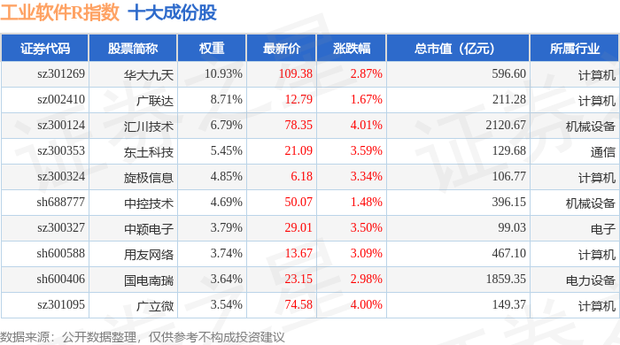 工业软件R(480034)指数十大成份股详情如下:
