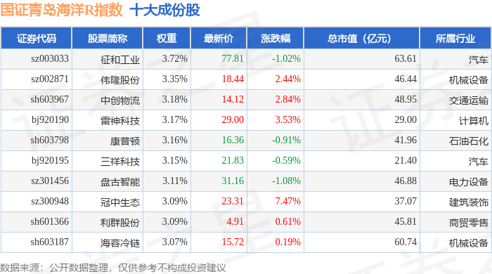 国证青岛海洋R(480532)指数十大成份股详情如下: