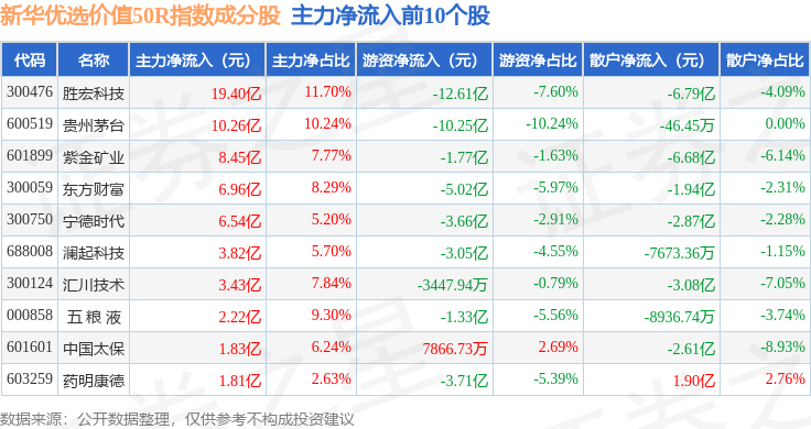 资金流向方面,新华优选价值50R(489004)指数成份股当日主力资金净流入合计50.24亿元,游资资金净流出合计31.44亿元,散户资金净流出合计18.8亿元。成份股资金流向详情见下表: