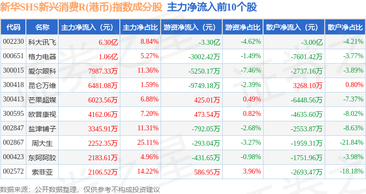 资金流向方面,新华SHS新兴消费R(港币)(489007)指数成份股当日主力资金净流入合计4.63亿元,游资资金净流出合计3.98亿元,散户资金净流出合计6512.3万元。成份股资金流向详情见下表: