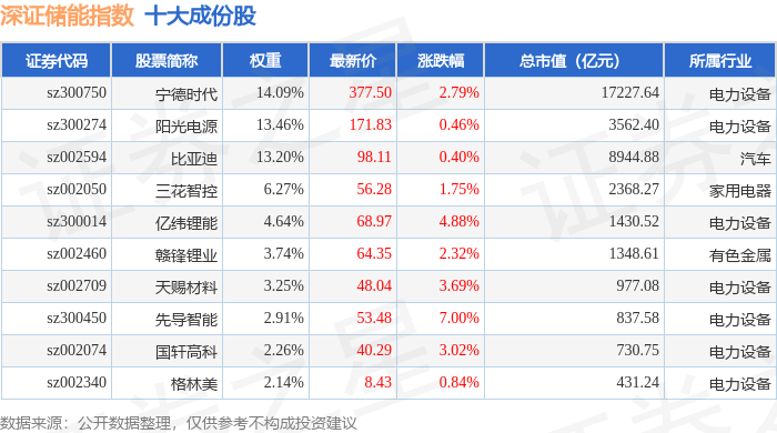 深证储能(970036)指数十大成份股详情如下: