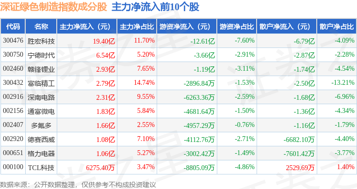 资金流向方面,深证绿色制造(970069)指数成份股当日主力资金净流入合计23.17亿元,游资资金净流出合计28.69亿元,散户资金净流入合计5.52亿元。成份股资金流向详情见下表: