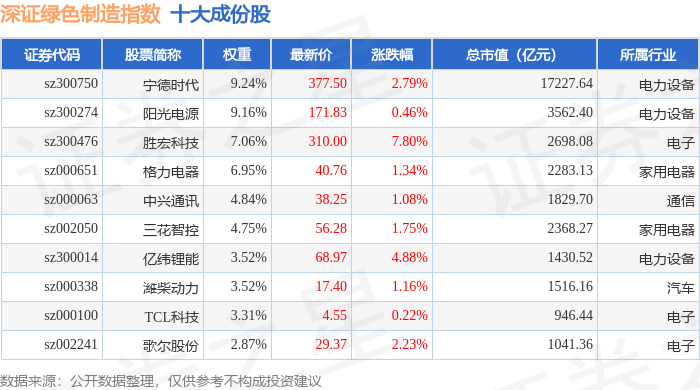 深证绿色制造(970069)指数十大成份股详情如下: