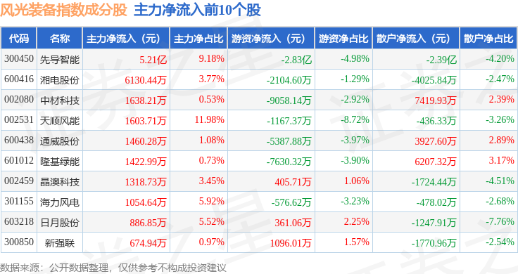 资金流向方面,风光装备(980026)指数成份股当日主力资金净流出合计6.4亿元,游资资金净流出合计5.5亿元,散户资金净流入合计11.9亿元。成份股资金流向详情见下表:
