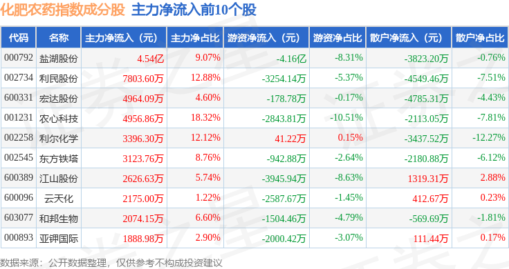 资金流向方面,化肥农药(980035)指数成份股当日主力资金净流入合计5.76亿元,游资资金净流出合计4.98亿元,散户资金净流出合计7640.92万元。成份股资金流向详情见下表: