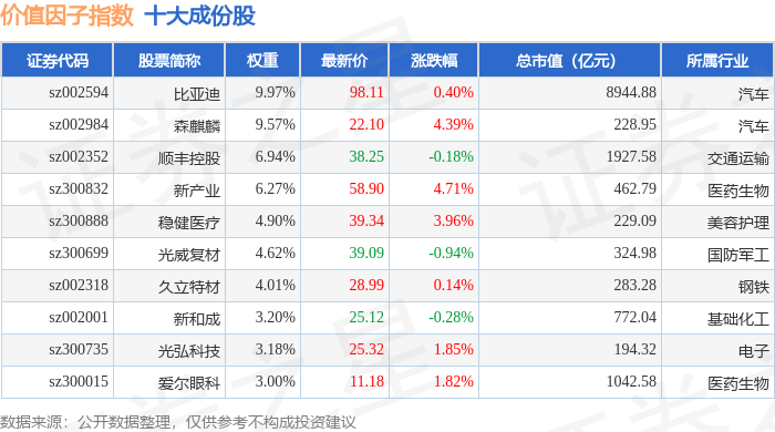 证券之星消息,1月5日,价值因子(980056)指数报收于2716.75点,涨1.69%,成交531.83亿元,换手率0.97%。当日该指数成份股中,上涨的有39家,斯菱智驱以16.08%的涨幅领涨,下跌的有11家,迈为股份以5.81%的跌幅领跌。