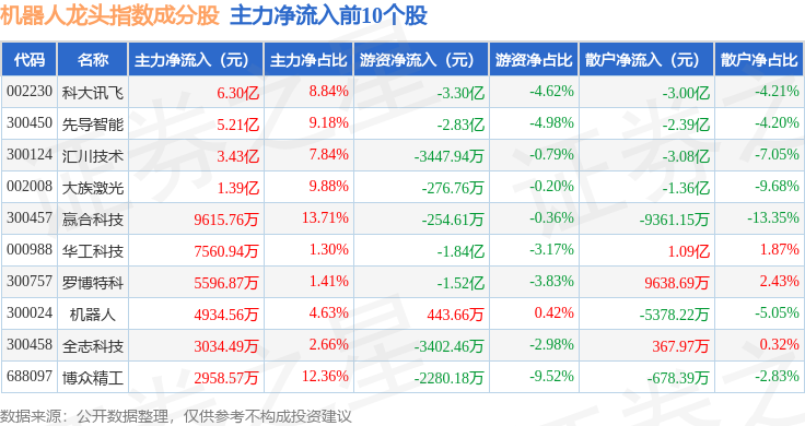 资金流向方面,机器人龙头(980071)指数成份股当日主力资金净流入合计5.48亿元,游资资金净流出合计8.88亿元,散户资金净流入合计3.4亿元。成份股资金流向详情见下表: