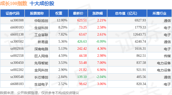 成长100(980080)指数十大成份股详情如下: