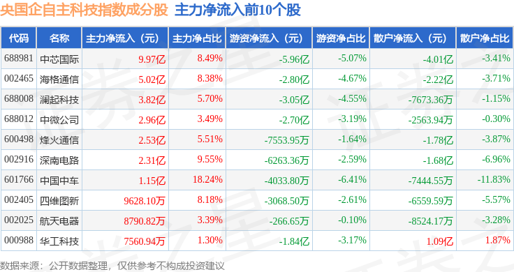 资金流向方面,央国企自主科技(980083)指数成份股当日主力资金净流入合计28.24亿元,游资资金净流出合计18.35亿元,散户资金净流出合计9.89亿元。成份股资金流向详情见下表: