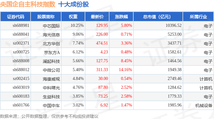 央国企自主科技(980083)指数十大成份股详情如下: