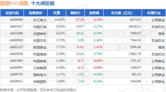 资金流向方面,能源ESG(980133)指数成份股当日主力资金净流出合计9843.48万元,游资资金净流出合计3867.47万元,散户资金净流入合计1.37亿元。成份股资金流向详情见下表: