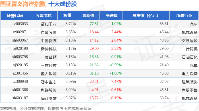 国证青岛海洋(980532)指数十大成份股详情如下: