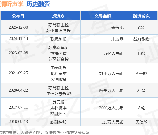 证券之星消息,根据天眼查APP于12月30日公布的信息整理,苏州清听声学科技有限公司C轮融资,融资额未披露,参与投资的机构包括苏高新金控,苏州国发创投。