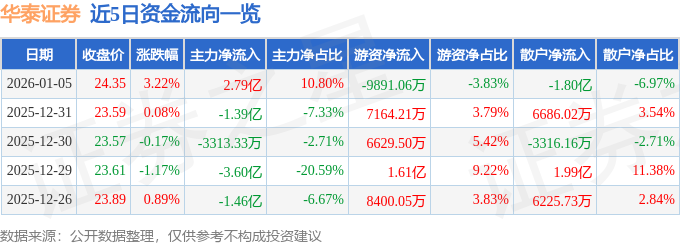 证券之星消息,截至2026年1月5日收盘,华泰证券(601688)报收于24.35元,上涨3.22%,换手率1.46%,成交量106.91万手,成交额25.83亿元。